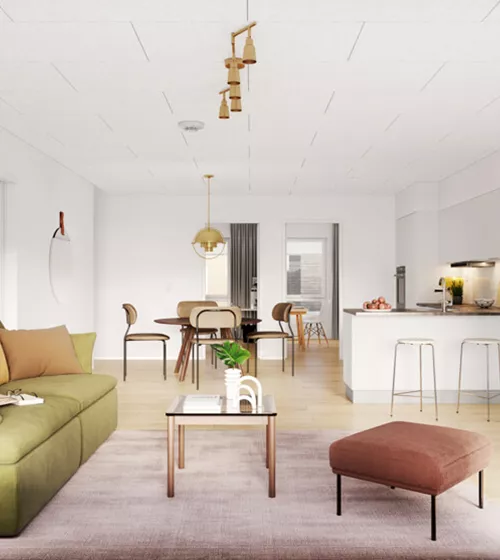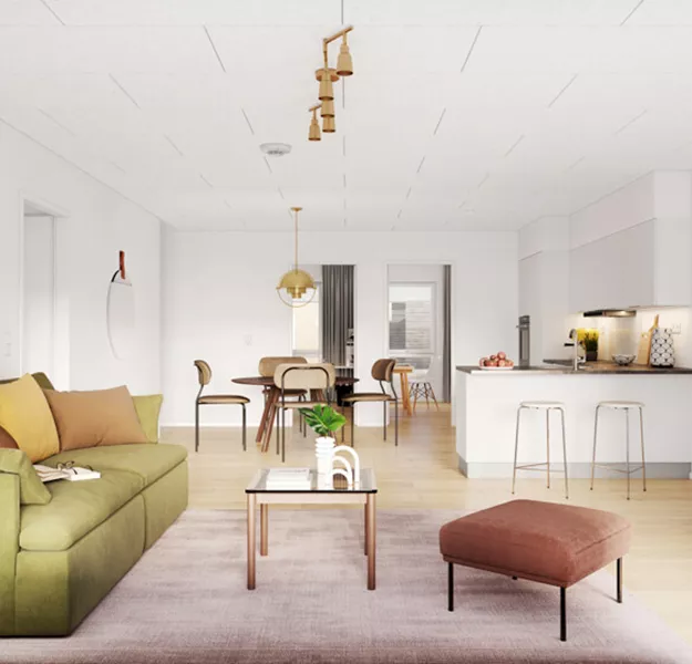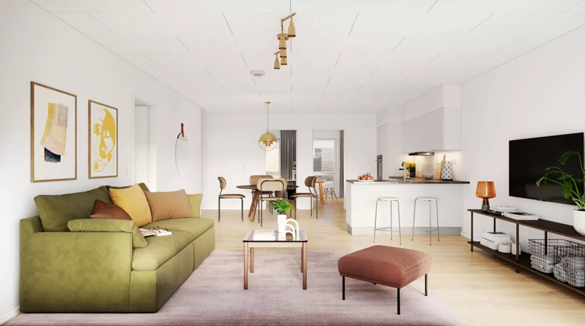 Her har du et stort og lækkert køkken-alrum, der naturligt opdeles med det vinklede køkken. I køkkenområdet er der plads til er stort spisebord og i resten af alrummet har du plads til en stor sofa og tv-område.