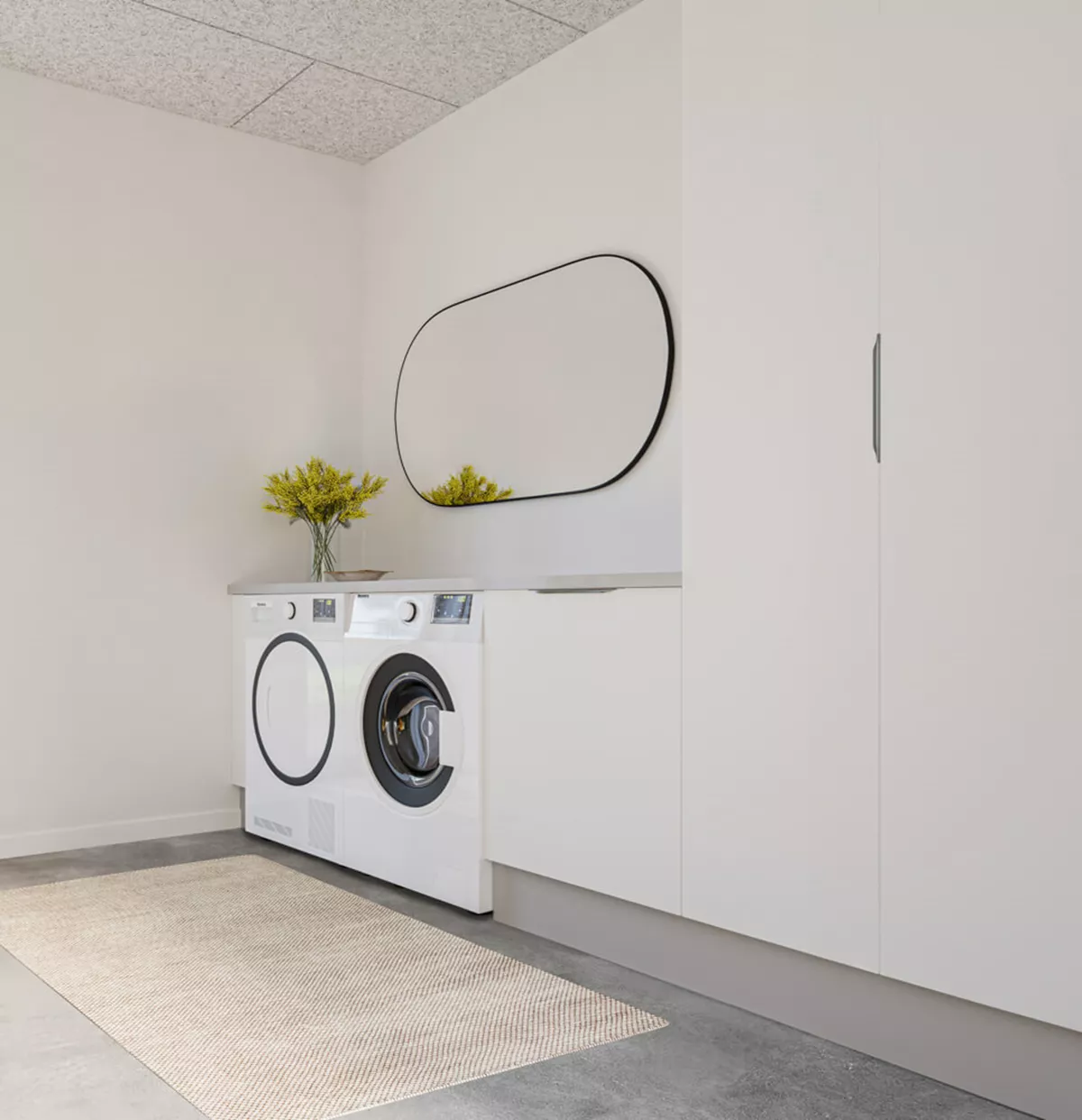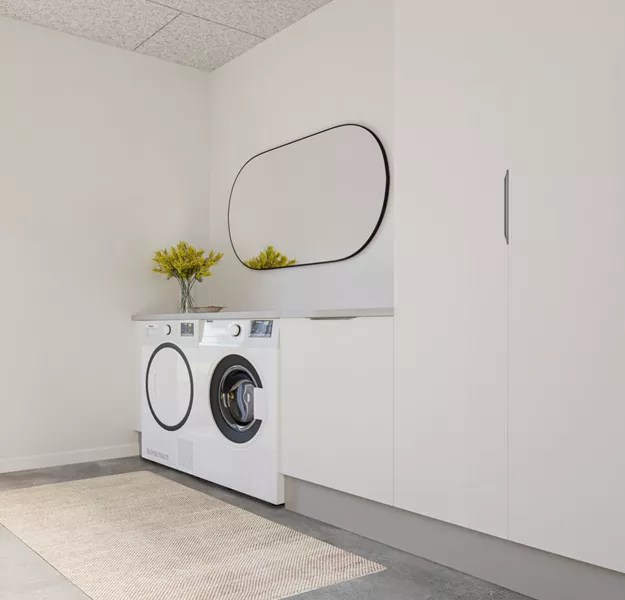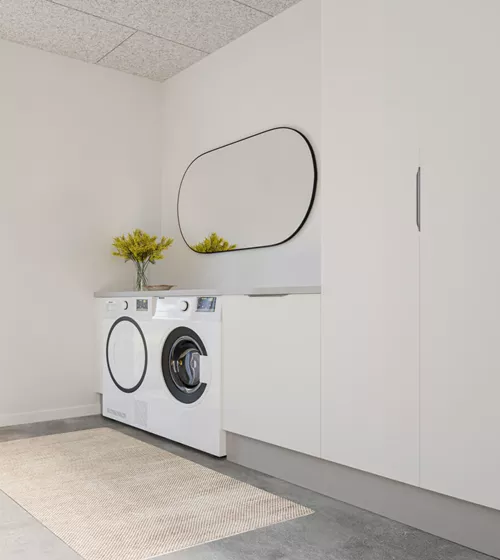 Når du træder ind i boliger, bliver du mødt af den fine entré. Her er der gjort god plads til opbevaring via rummelige højskabe. Det er desuden også her din vaskemaskine og tørretumbler er placeret.
