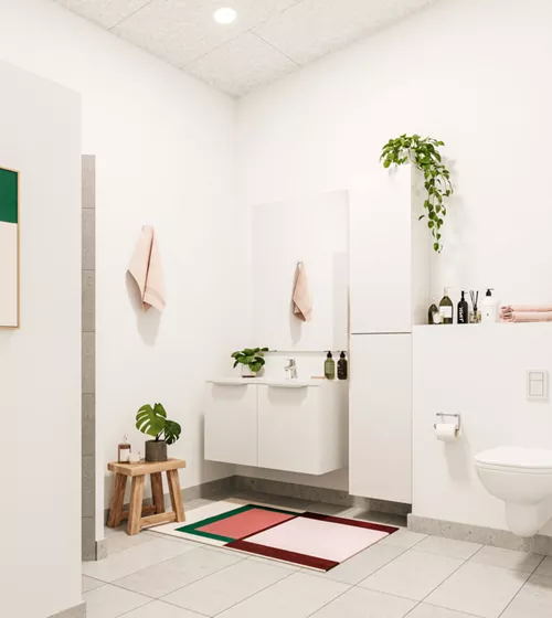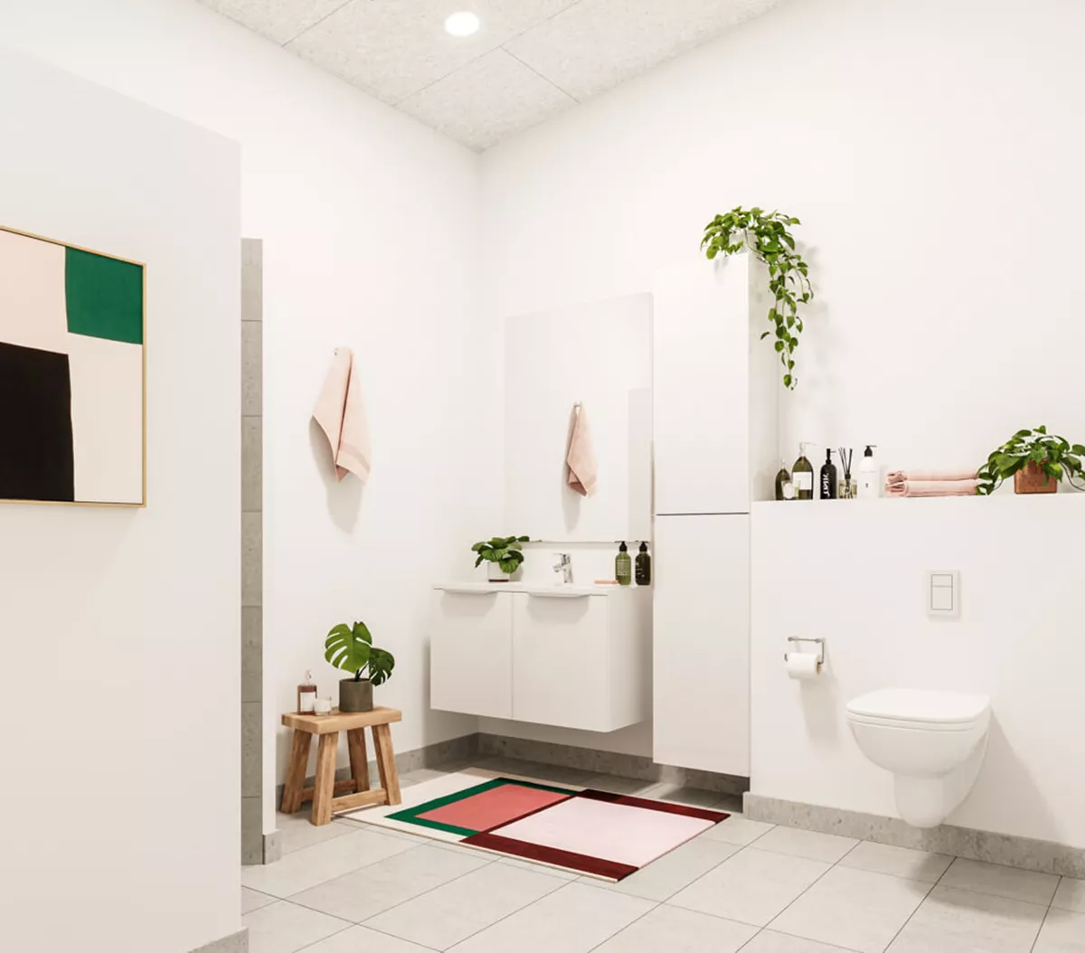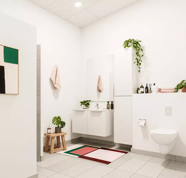 Badeværelset opføres i flotte materialer, der passer til resten af boligen og indeholder bruseniche, toilet og håndvask.