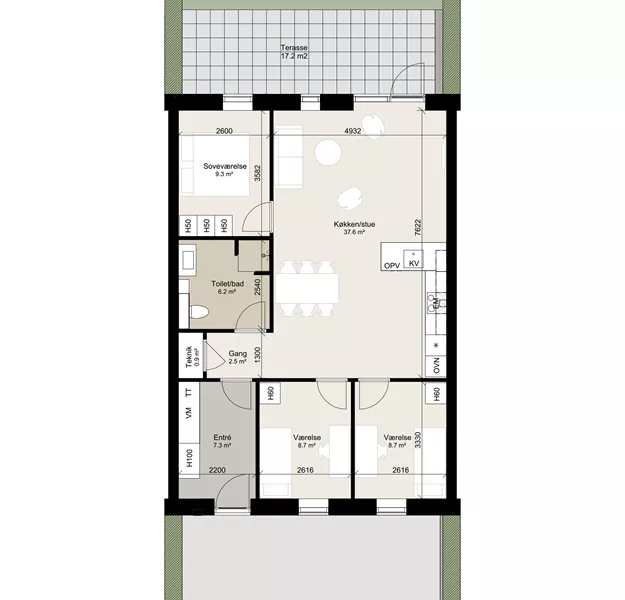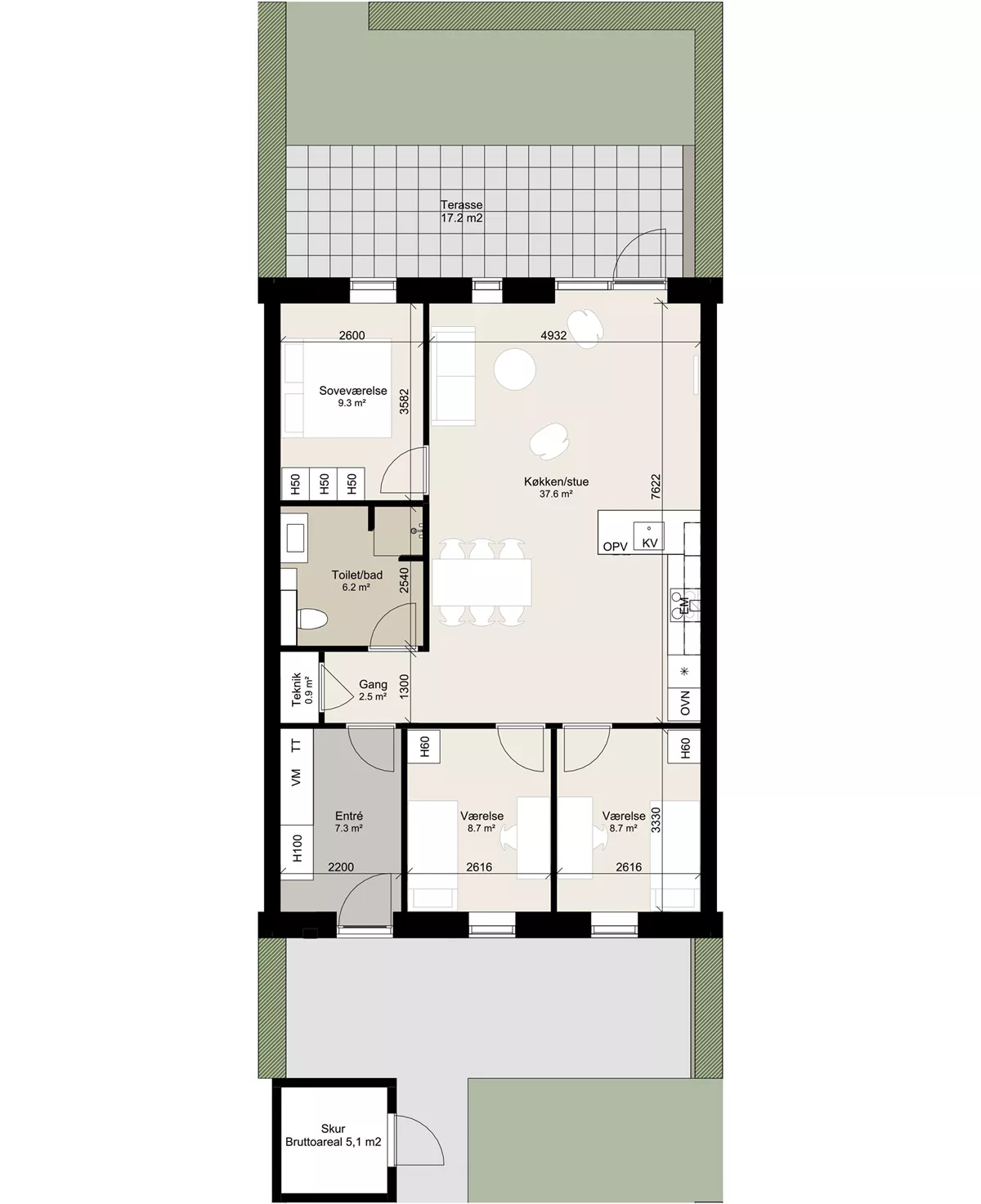 Bag boligen har du en terrasse med fin plads til havemøbler samt et grønt område til blomster eller plantekasser. Foran boligen ligger dit private skur og et flisebelagt område, hvor du kan have et fint cafébord. Obs. alle billeder og plantegninger er vejledende.