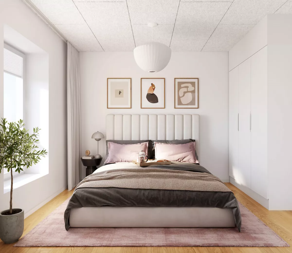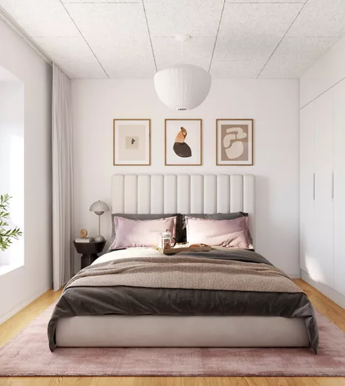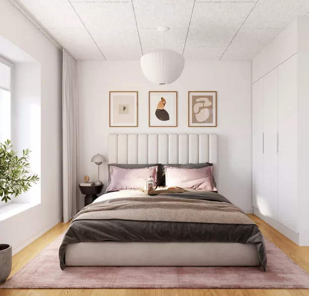 Boligen indeholder i alt tre værelser. Soveværelset er placeret i den ene ende med udgang til stuen. Rummet opføres med tre fastmonterede opbevaringsskabe og har fint plads til en stor seng og ekstra indretning. De resterende værelser ligger i modsatte ende. Værelserne er optimale som børneværelse, gæsteværelse eller kontor.