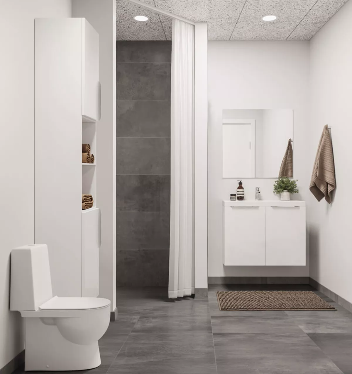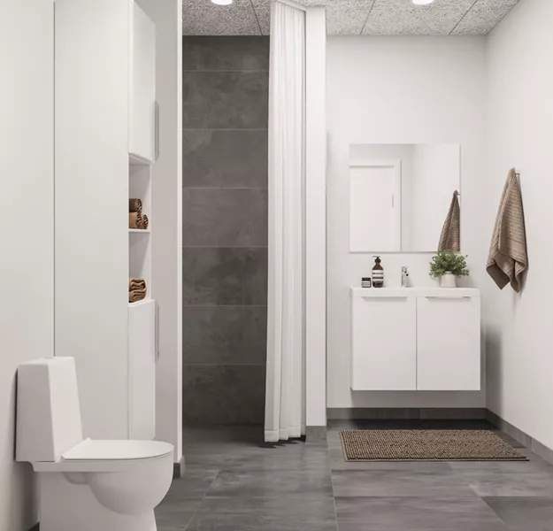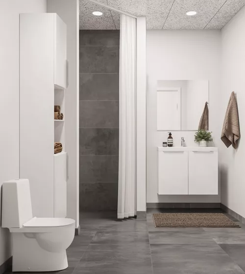 Rækkehusets badeværelse indeholder en lækker bruseniche, toilet og håndvask. Badeværelset materialer passer stilmæssigt til resten af boligen.