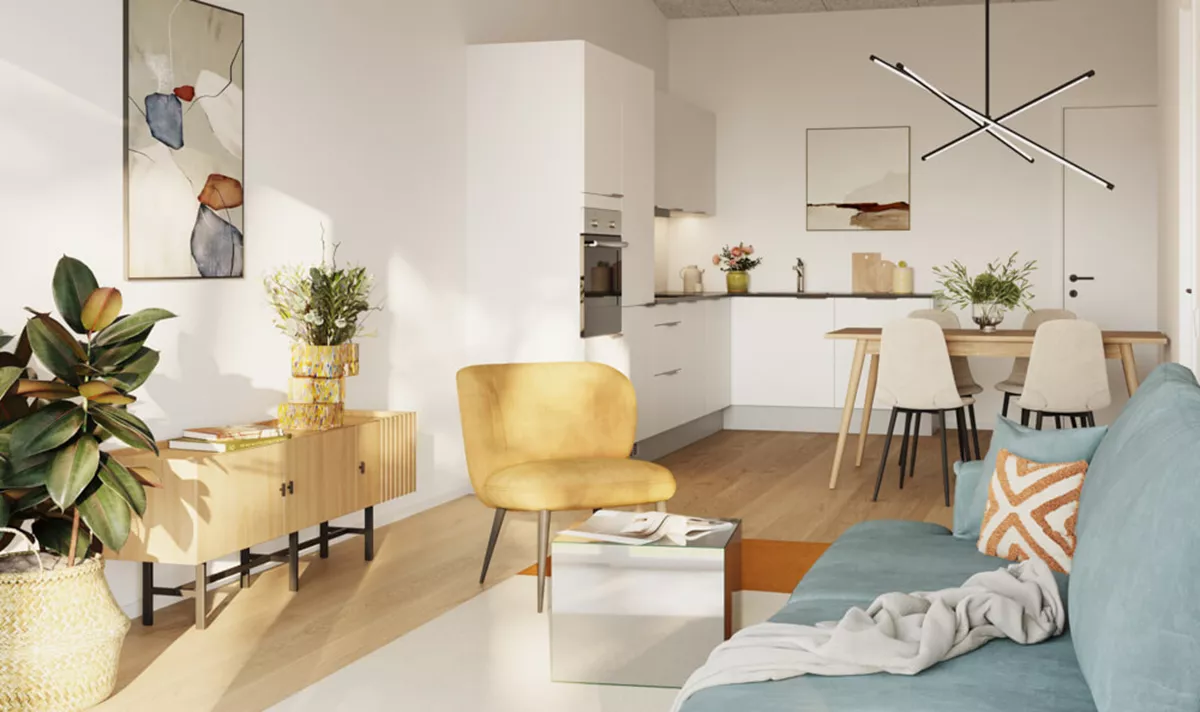 Til dette rækkehus får en stor terrasse med plads til solsenge m.v. Der er åben udsigt over de fine fællesarealer. Obs. alle billeder og plantegninger er vejledende.