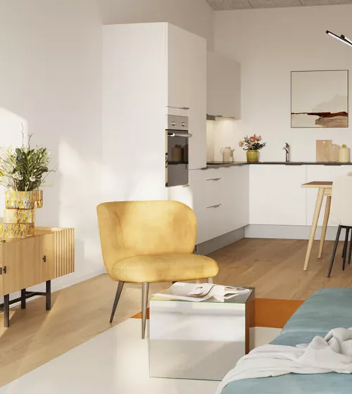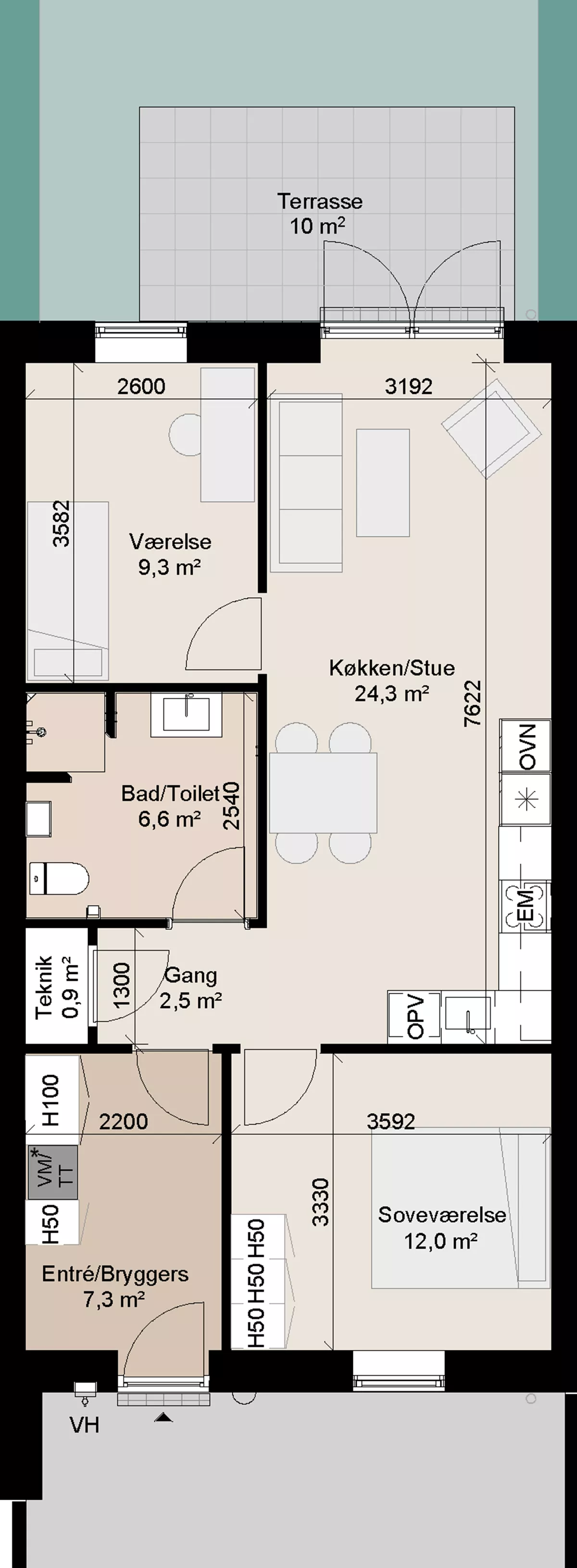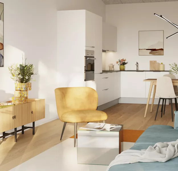 I dette 3-værelses rækkehus er køkken og stue placeret i forlængelse af hinanden. Køkkenet er placeret i en vinkel, hvor der er plads til spisebord. I forlængelse af dette er der et hyggeligt område til sofa og fjernsyn. Der er direkte adgang til terrassen fra stuen.