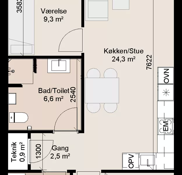 Boligens bryggers har fastmonterede højskabe til opbevaring. Her er også god plads til knagerækker og skohylder. Derudover kan du installere din vaskemaskine/tørretumbler her. Obs. Dette medfølger ikke når du lejer din bolig.