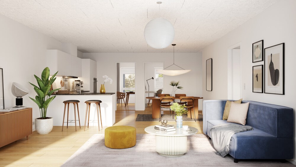 Når du træder ind i boliger, bliver du mødt af den fine entré. Her er der gjort god plads til opbevaring via rummelige højskabe. Det er desuden også her du kan installere din egen vaskemaskine/tørretumbler.