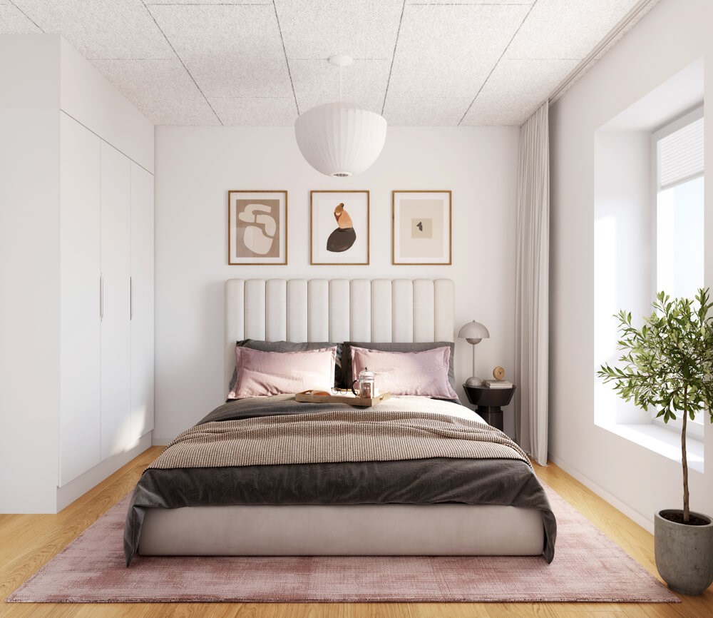 Boligen indeholder i alt tre værelser. Soveværelset er placeret i den ene ende med udgang til stuen. Rummet opføres med tre fastmonterede opbevaringsskabe og rummer fint plads til en stor seng og ekstra indretning. De resterende værelser ligger i modsatte ende. Værelserne er optimale som børneværelse, gæsteværelse eller kontor.
