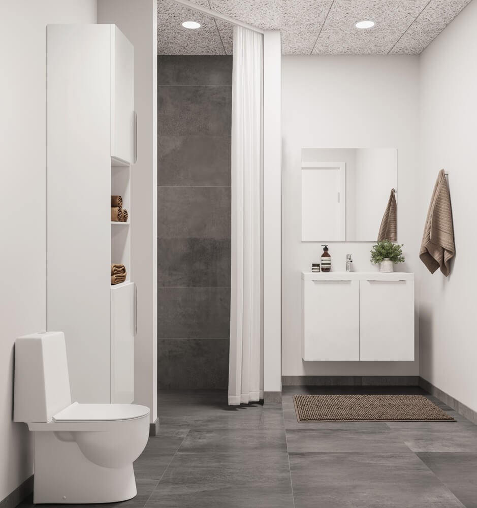 Badeværelset opføres i flotte og stilrene materialer der passer til resten af boligen og indeholder bruseniche, toilet og håndvask.