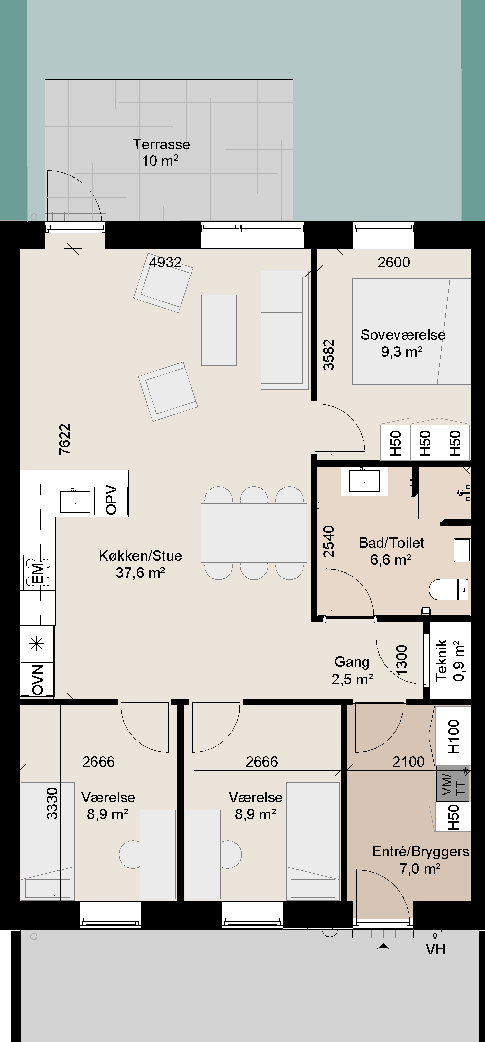 Til dette skønne rækkehus får du en dejlig terrasse. Obs. alle billeder og plantegninger er vejledende.