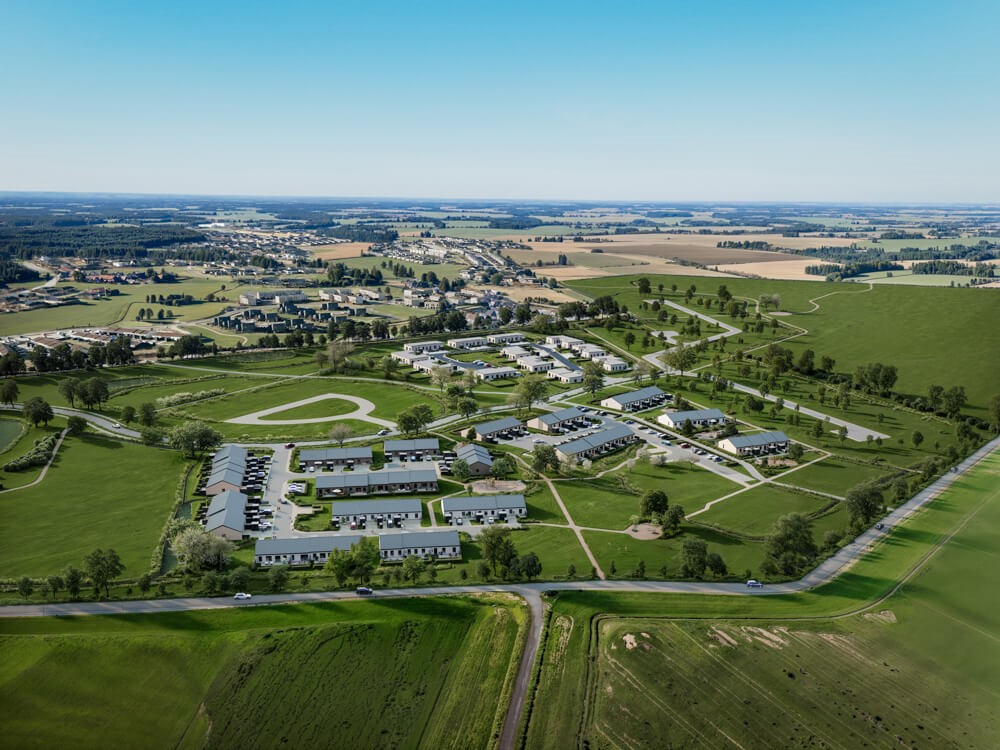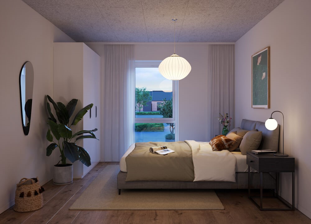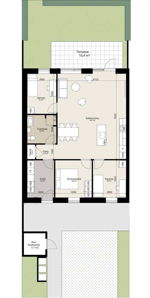 Bag boligen finder du en terrasse med plads til både havemøbler og hyggelige udendørsaktiviteter. Det tilhørende grønne område er ideelt til blomsterbede eller små plantekasser. Foran boligen ligger dit private skur og et flisebelagt område, hvor du kan placere et cafébord eller dekorationer. Obs. alle billeder og plantegninger er vejledende.