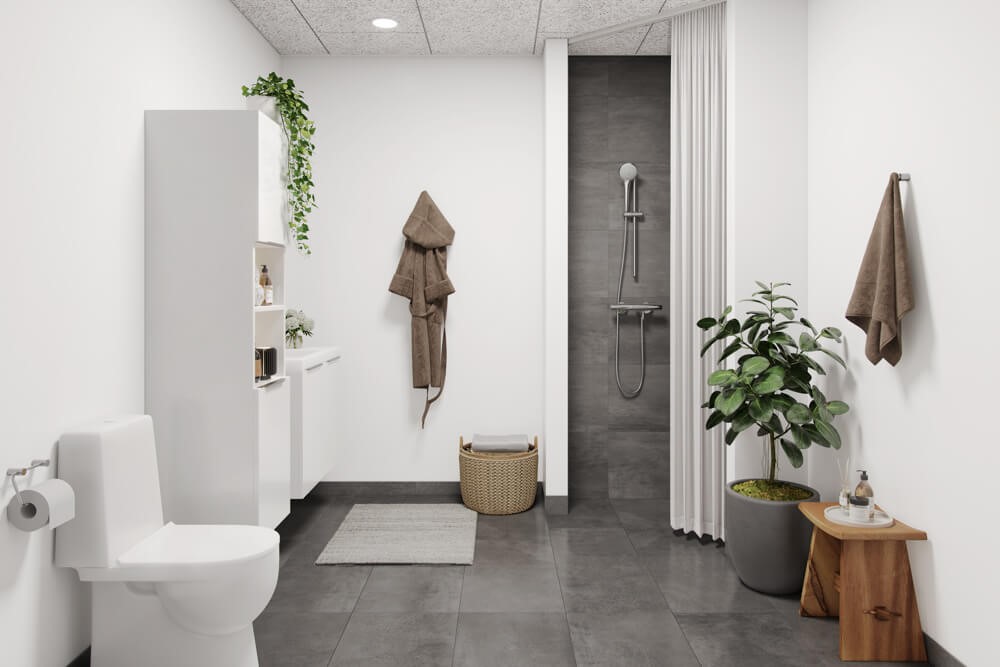 Badeværelset er centralt placeret i boligen, hvilket sikrer nem adgang fra alle rum. Rummet er udstyret med bruseniche, toilet, håndvask og et praktisk opbevaringsskab, der gør hverdagen mere bekvem.