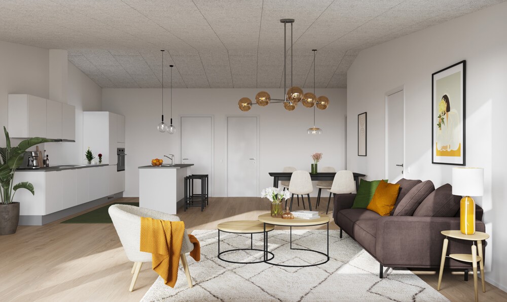 I denne rummelige fireværelses bolig er køkken-alrummet boligens naturlige samlingspunkt. Det moderne køkken er placeret langs den ene væg og udføres i lyse HTH-elementer med alle nødvendige hårde hvidevarer. Den stilfulde køkken-ø skaber en flydende overgang til opholdsrummet, hvor der er god plads til et større spisebord. I den modsatte ende af alrummet kan du indrette et indbydende stueområde med direkte adgang til boligens terrasse.