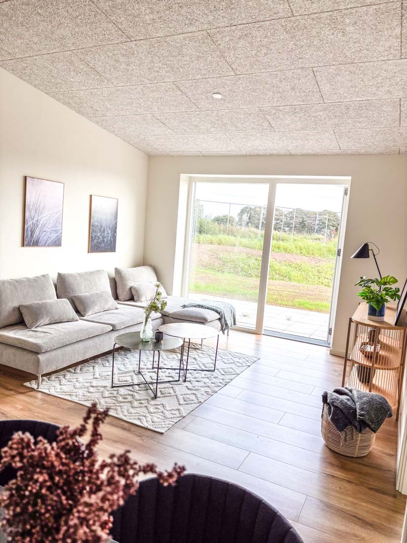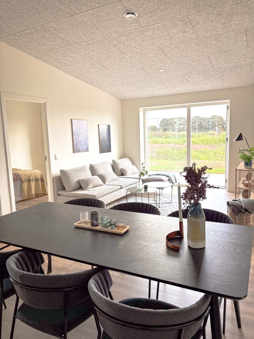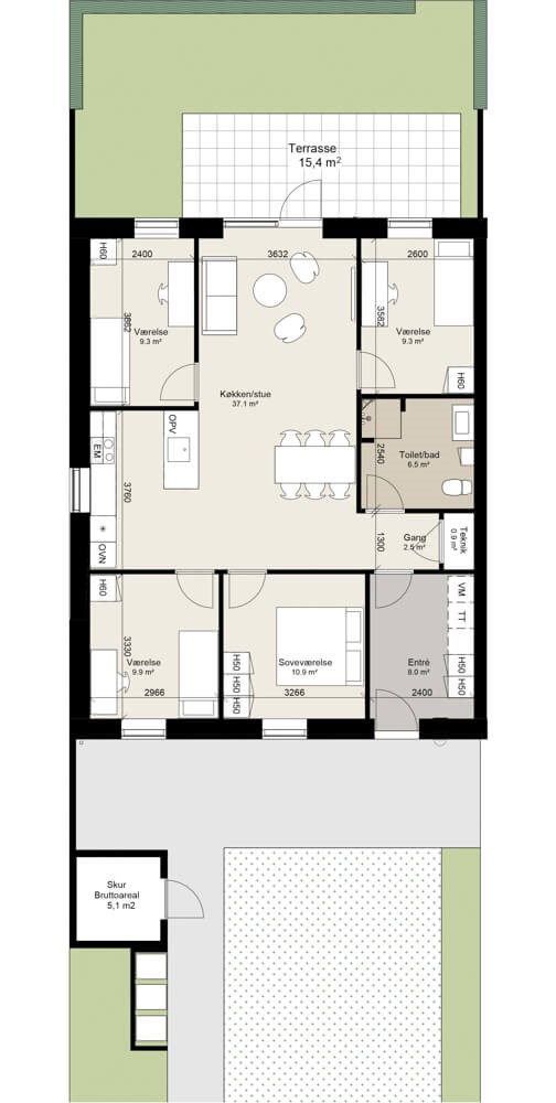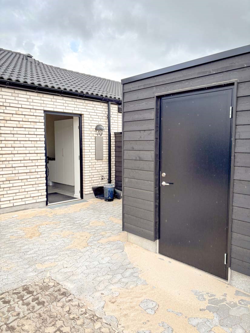 Bag boligen finder du en generøs terrasse, der giver mulighed for at indrette et hyggeligt uderum med havemøbler og planter. Foran boligen ligger et privat skur samt et flisebelagt område, som kan bruges til opbevaring eller pyntes med krukker og dekorationer. Obs. alle billeder og plantegninger er vejledende.