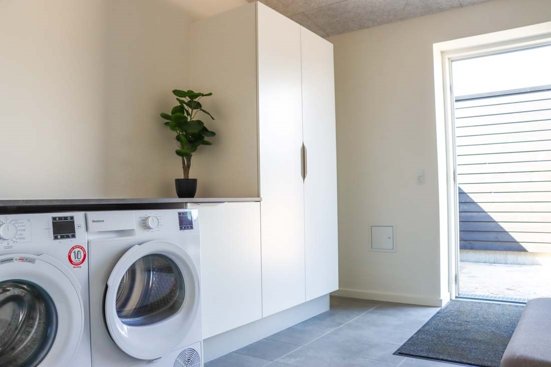 Entréen er praktisk indrettet med opbevaringsskabe til jakker og sko. Her finder du også din vaskemaskine og tørretumbler, som allerede er installeret. Der er desuden plads til at tilføje en skohylde eller knagerække for ekstra organisering.