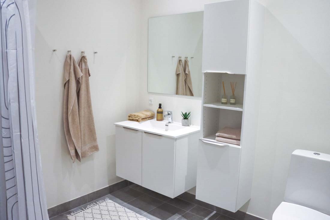 Badeværelset er indrettet med moderne materialer og har alt, hvad du behøver til hverdagens behov. Det inkluderer en stor bruseniche, toilet og håndvask, hvilket giver rummet et stilrent og funktionelt udtryk.