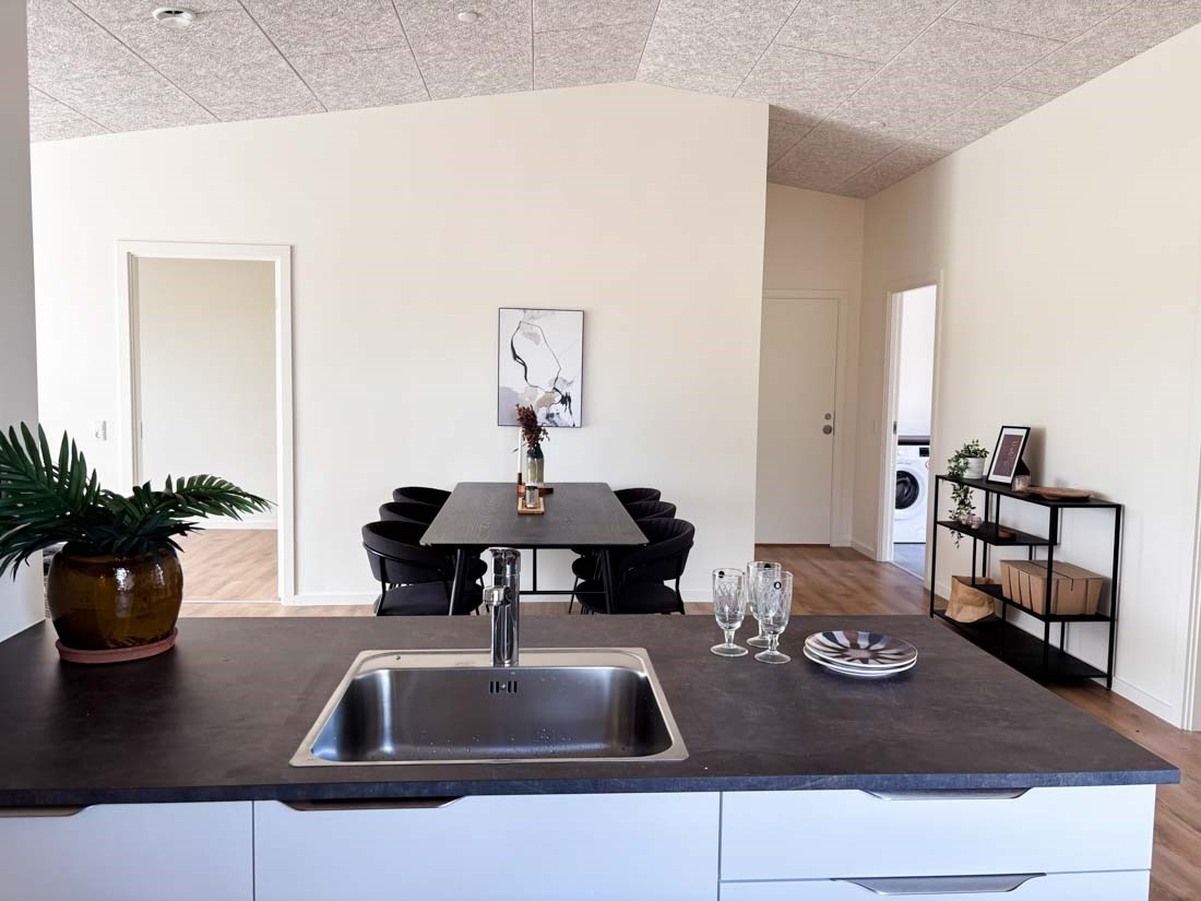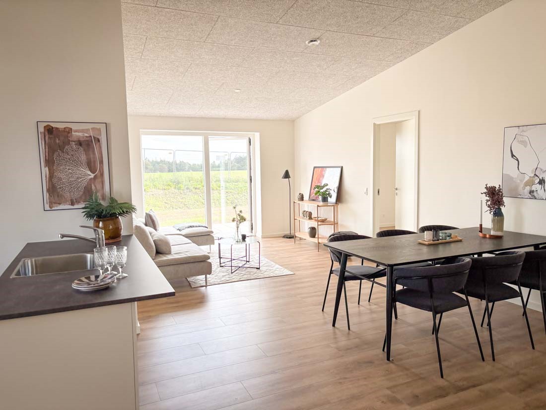 I dette funktionelle femværelses rækkehus er køkken-alrummet boligens naturlige midtpunkt. Køkkenet er placeret i et indhak i opholdsrummet. Dette giver god plads til både et stort spisebord og en hyggelig sofagruppe i resten af rummet. De lyse overflader kombineret med moderne hårde hvidevarer skaber et både æstetisk og praktisk køkkenmiljø. Fra stuen er der direkte adgang til en rummelig terrasse, som indbyder til afslapning og hyggelige udendørsaktiviteter.
