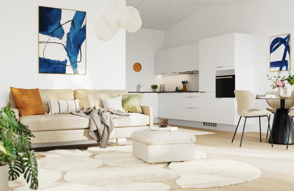 Køkkenet er placeret i en vinkel, hvilket skaber en naturlig overgang til stueområdet og giver ekstra plads til indretning med både spisebord og sofahjørne. De lyse overflader og moderne hårde hvidevarer sikrer et funktionelt og æstetisk køkkenmiljø. Opholdsområdet er lyst og åbent, og fra stuen er der direkte adgang til en privat terrasse, som indbyder til udendørs afslapning.