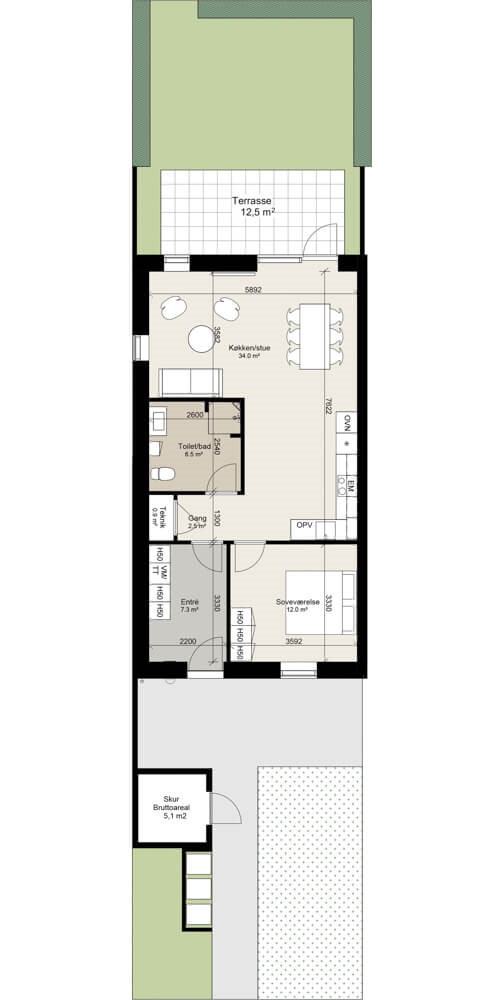 Bag boligen finder du en hyggelig terrasse med plads til både havemøbler og planter. Der er også et grønt område, som giver mulighed for at skabe en lille have eller et blomsterbed. Foran boligen har du adgang til et privat skur og et flisebelagt område, der kan bruges til opbevaring eller dekoration. Obs. alle billeder og plantegninger er vejledende.