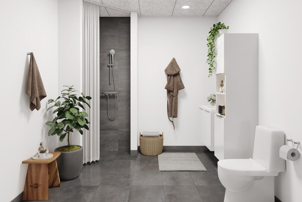 Badeværelset har alt, hvad du har brug for til hverdagen. Det er opført i tidløse materialer og rummer en bruseniche, toilet og håndvask, hvilket gør rummet både praktisk og indbydende.