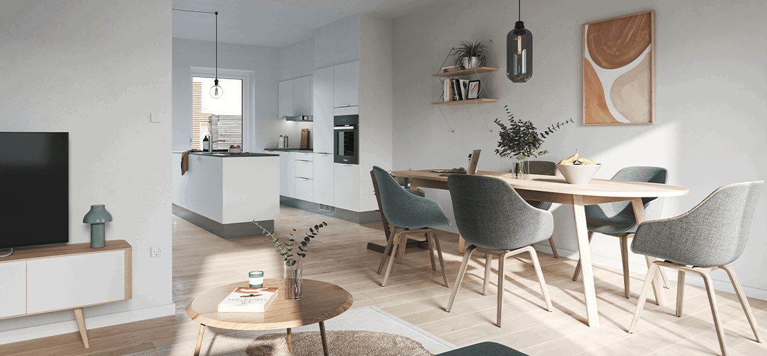 Alle lejeboligerne i Harehaven, Støvring har et lyst og indbydende hjerterum i form af et køkken-alrum, der åbner op til stuen. Det moderne HTH-køkken er udført i lyse kvalitetsmaterialer og inkluderer hårde hvidevarer, der passer perfekt til det moderne hjem.