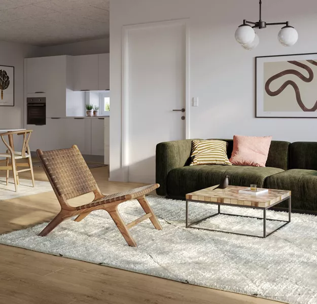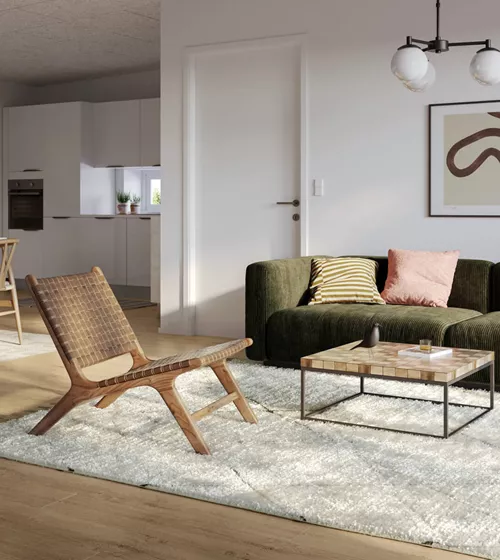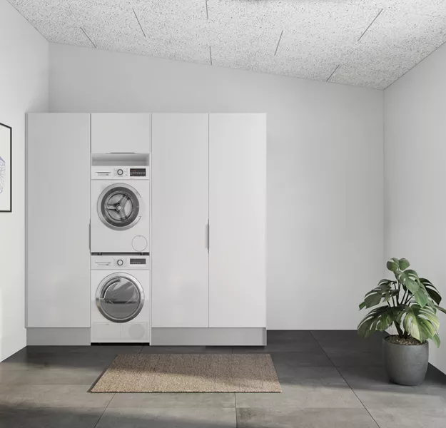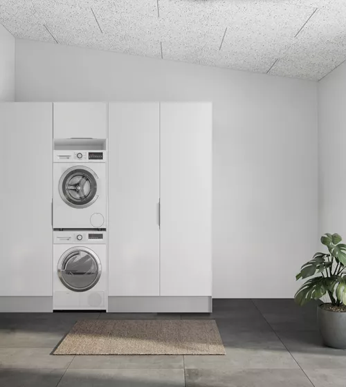 Når man træder ind i boligen, bliver man mødt af den fine entré. Denne er designet med masser af opbevaringsplads, vaskemaskine og tørretumbler. Ønskes mere opbevaring, er der også plads til det.