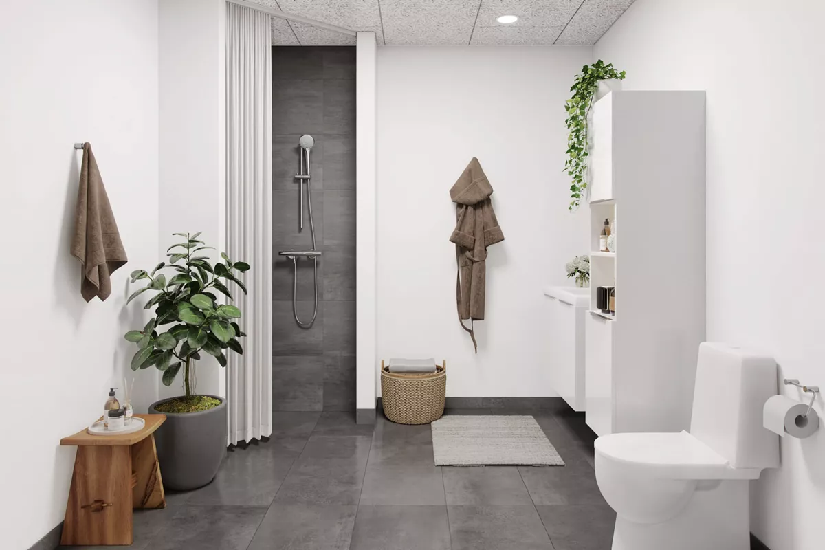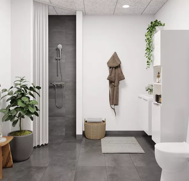Centralt placeret i boligen findes det lækre badeværelse med bruseniche, toilet, håndvask og hængende opbevaringsplads i stilrene materialer.