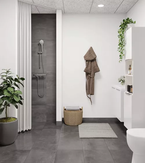 Boligens rummelige badeværelse opføres i moderne kvalitetselementer der passer godt til resten af boligen. Her finder du bruseniche, toilet, håndvask og ekstra opbevaring.