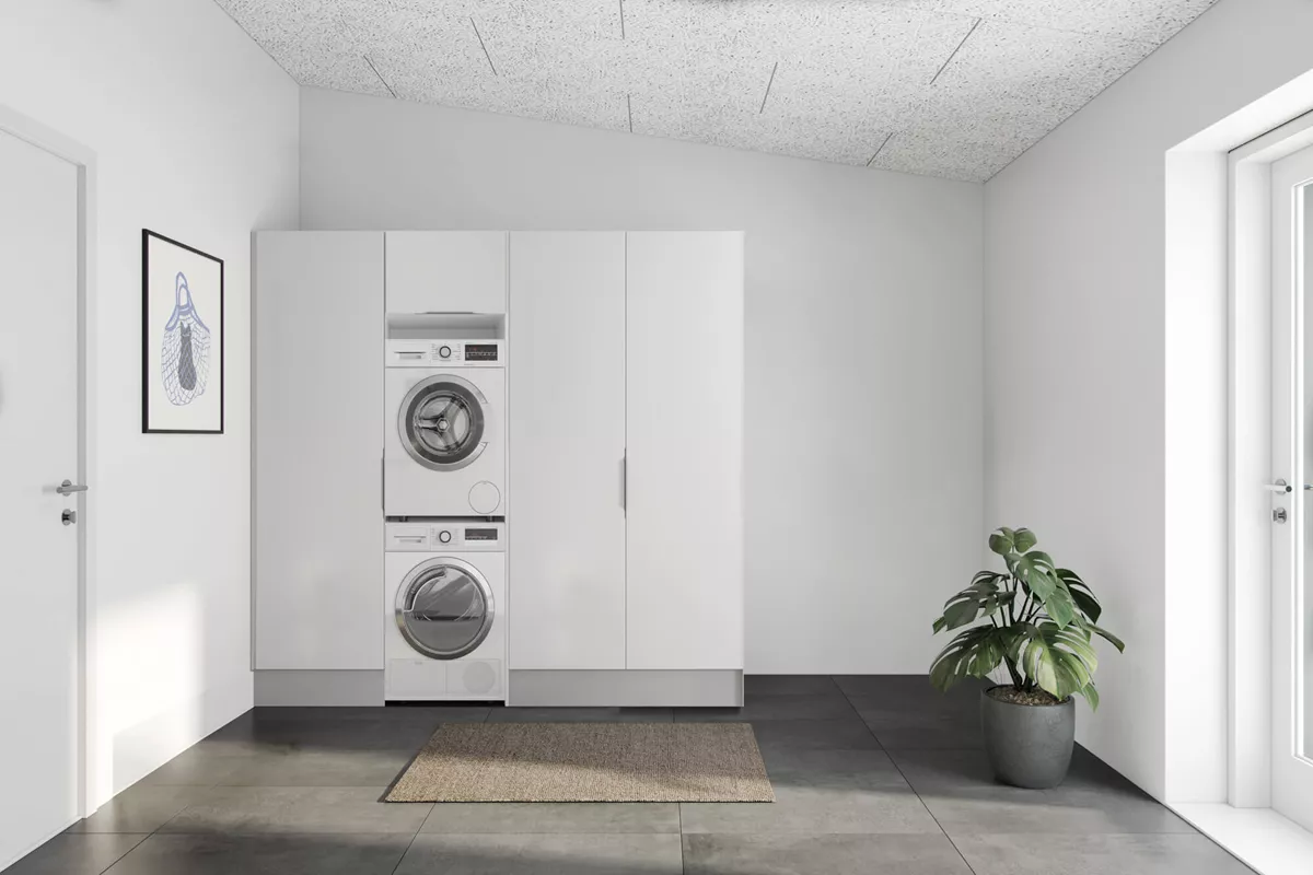 Boligen byder velkommen gennem den store entre, hvor du finder store fastmonterede skabe samt vaskemaskine og tørretumbler. Skulle du have brug for mere opbevaringsplads, er der ligeledes gjort plads til det.