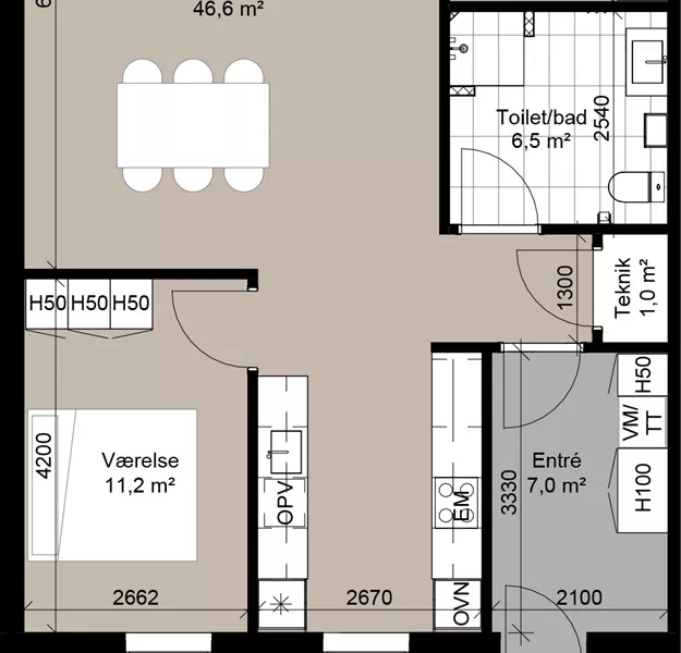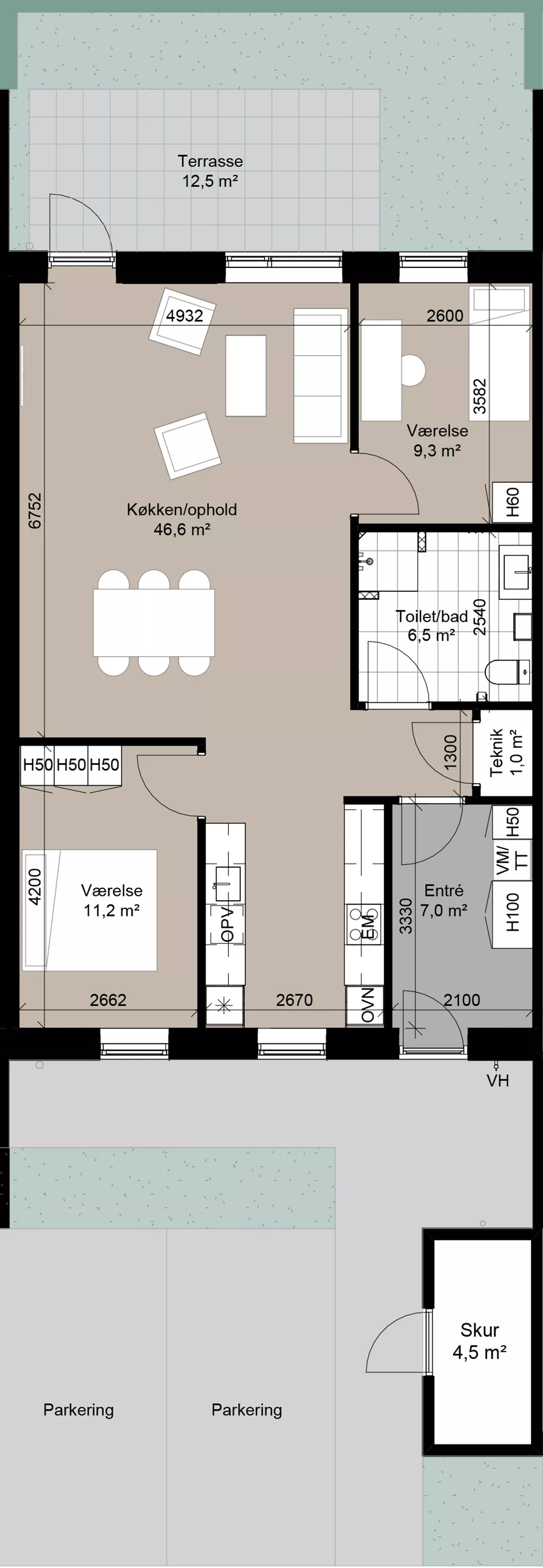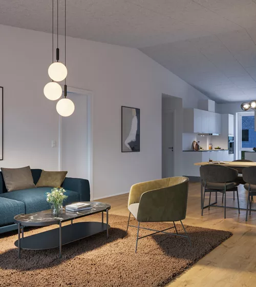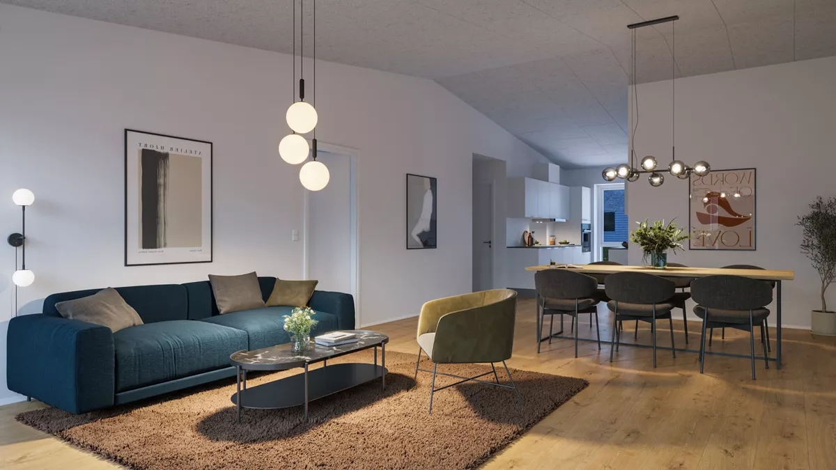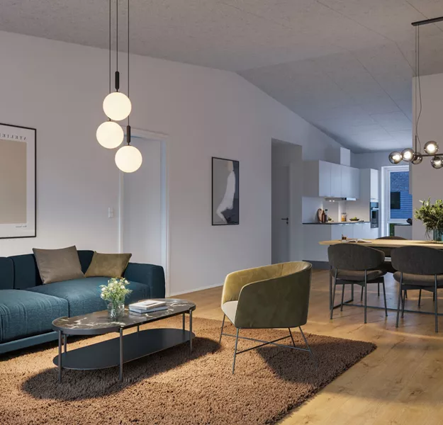 Dette fine treværelses rækkehus er fokuseret omkring boligens store køkken-alrum. Med en naturlig inddeling mellem køkken og stue, er pladsen optimeret til at indrette som man ønsker. Køkkenet er designet i stilrene materialer fra HTH og indeholder alt i hårde hvidevarer. Køkkenet er placeret i den ene ende af huset og her er god plads til at udforske sine evner som kok.