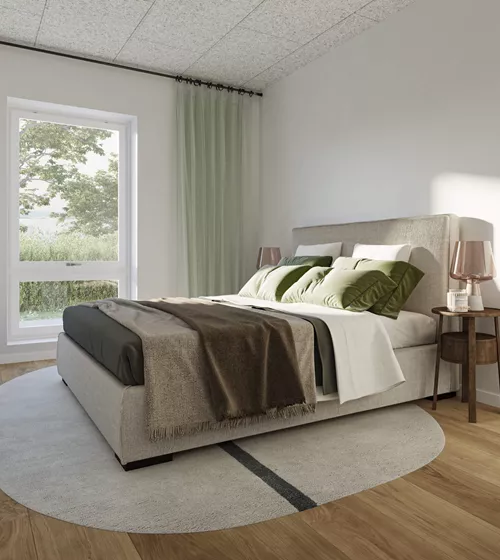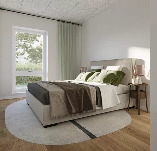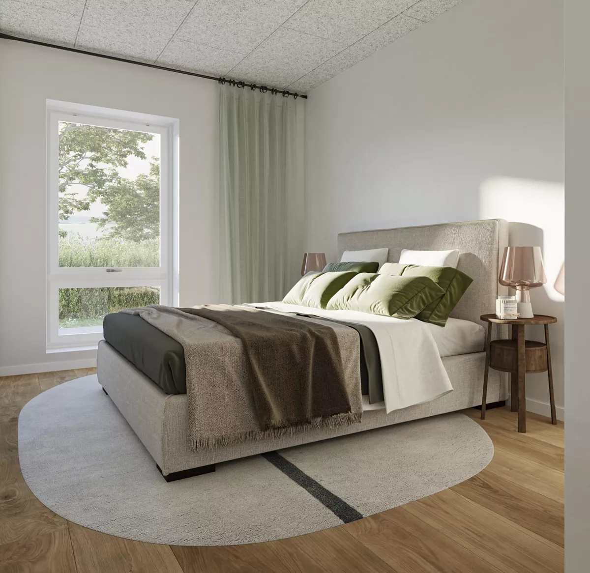 Boligens soveværelse og værelse er placeret i forskellige ender af huset. Soveværelset rummer rigelig plads til en dobbeltseng, sengeborde og ekstra opbevaring, skulle der være brug for det. Med gode opbevaringsmuligheder, plads til seng, skrivebord og mere, er ekstraværelset oplagt som børneværelse, kontor eller gæsteværelse.