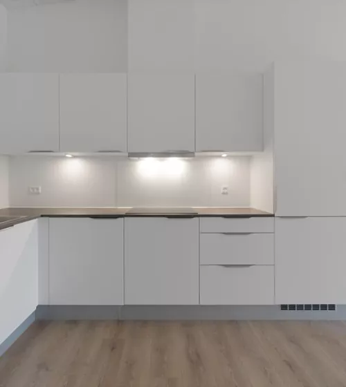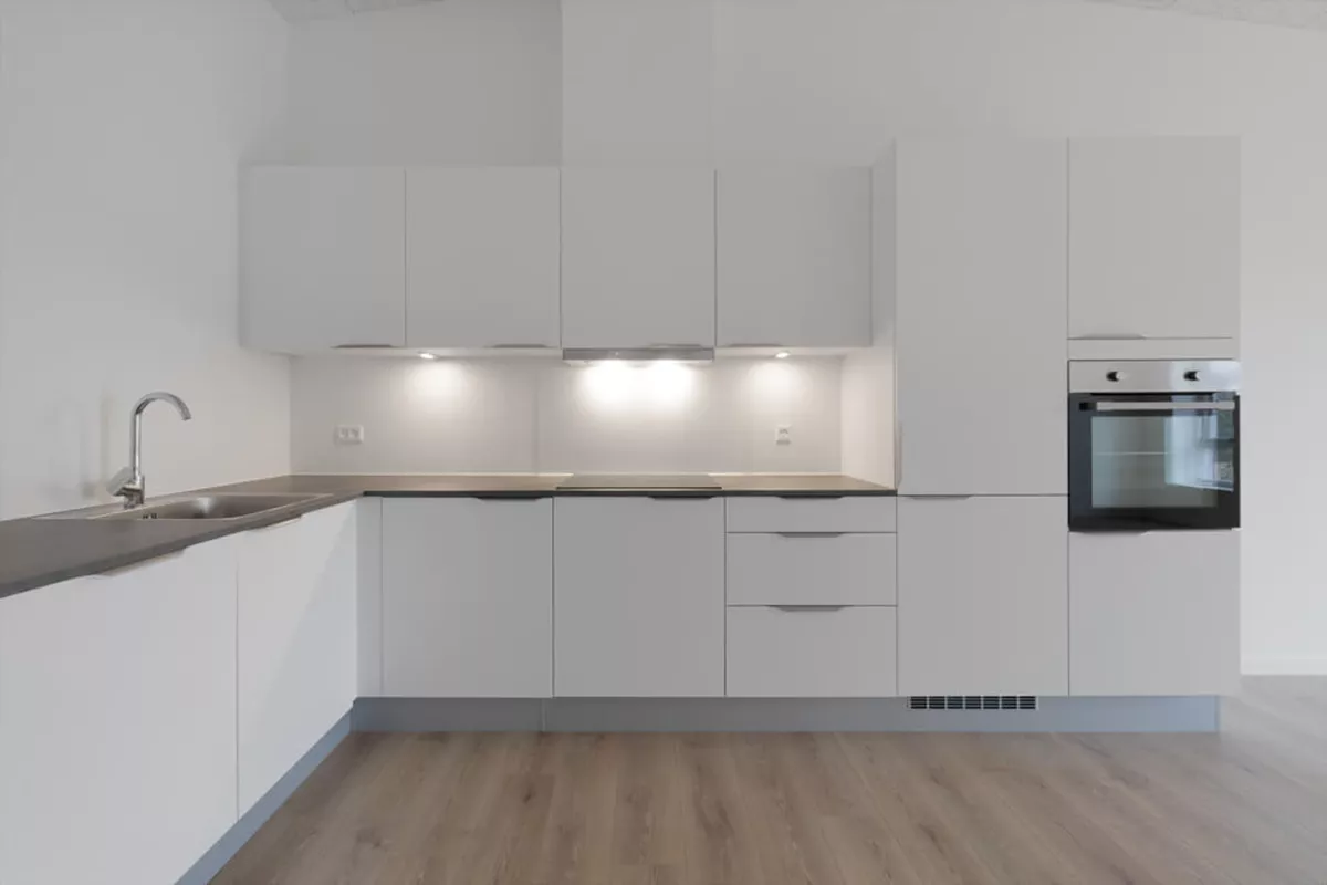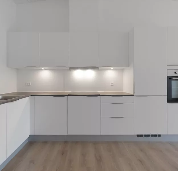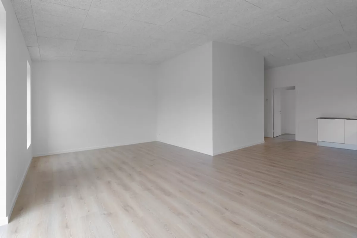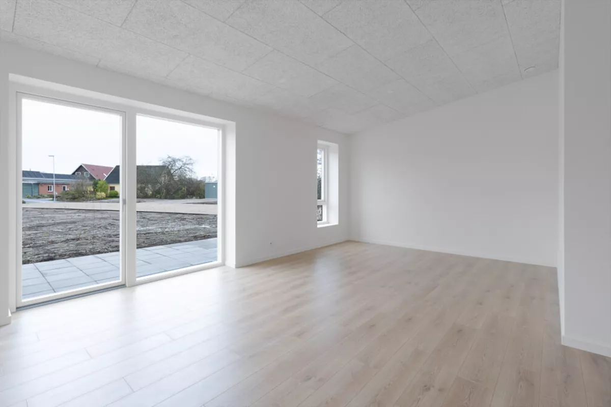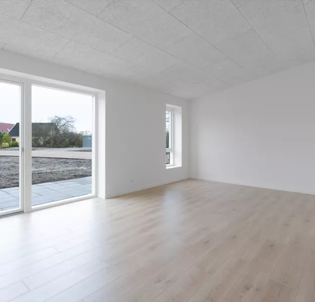 I dette attraktive rækkehus får du et større køkken-alrum. Køkkenet er placeret i rummets ene hjørne. Dette giver god plads til både spisebord og stueområde. Med en vinklet stue, er pladsen lettere at indrette dermed skabes en naturlig inddeling mellem køkken og stue.