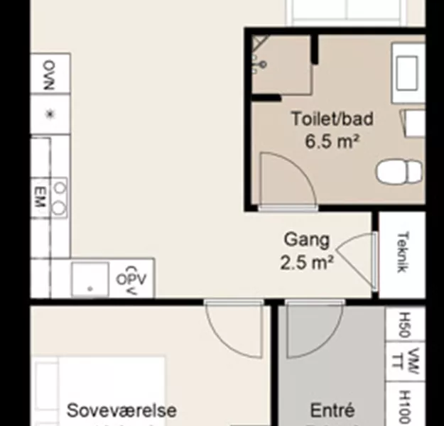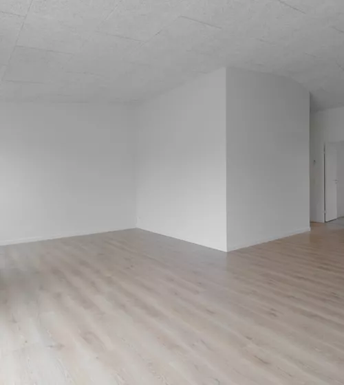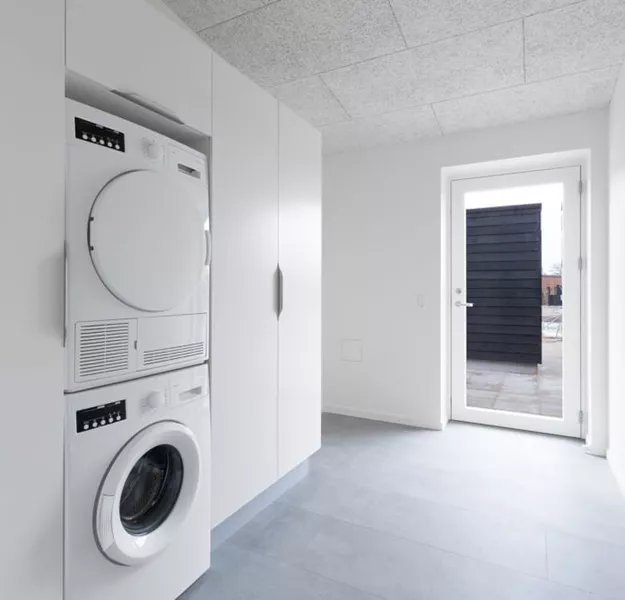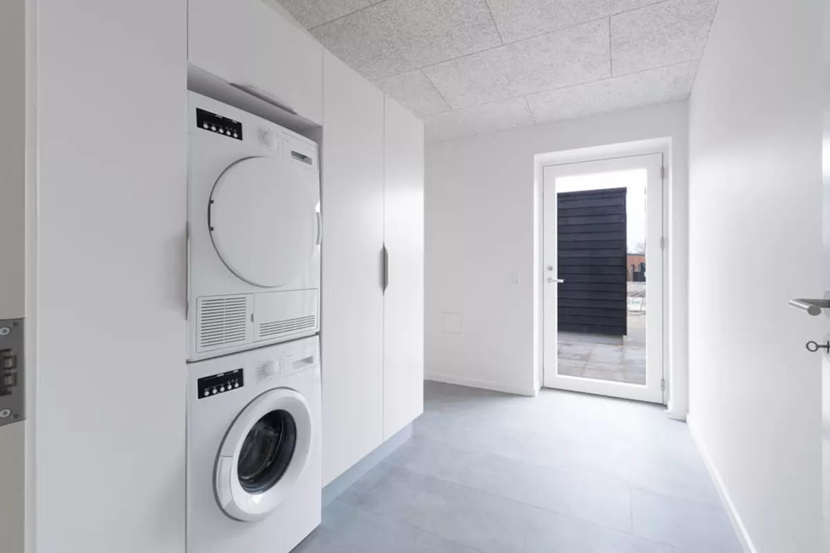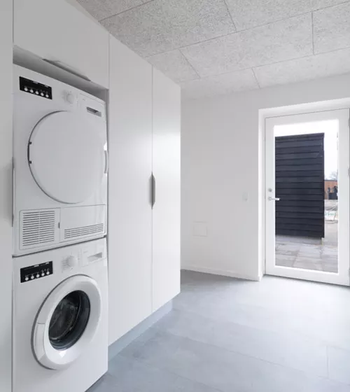 Det første du møder, når du træder ind i denne bolig, er den flotte entré. Her er både vaskesøjle og monterede højskabe til opbevaring. Der er desuden god plads til at tilføje ekstra elementer til indretningen såsom skoskab, planter, en bænk eller stumtjener.