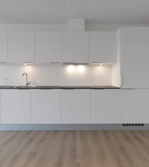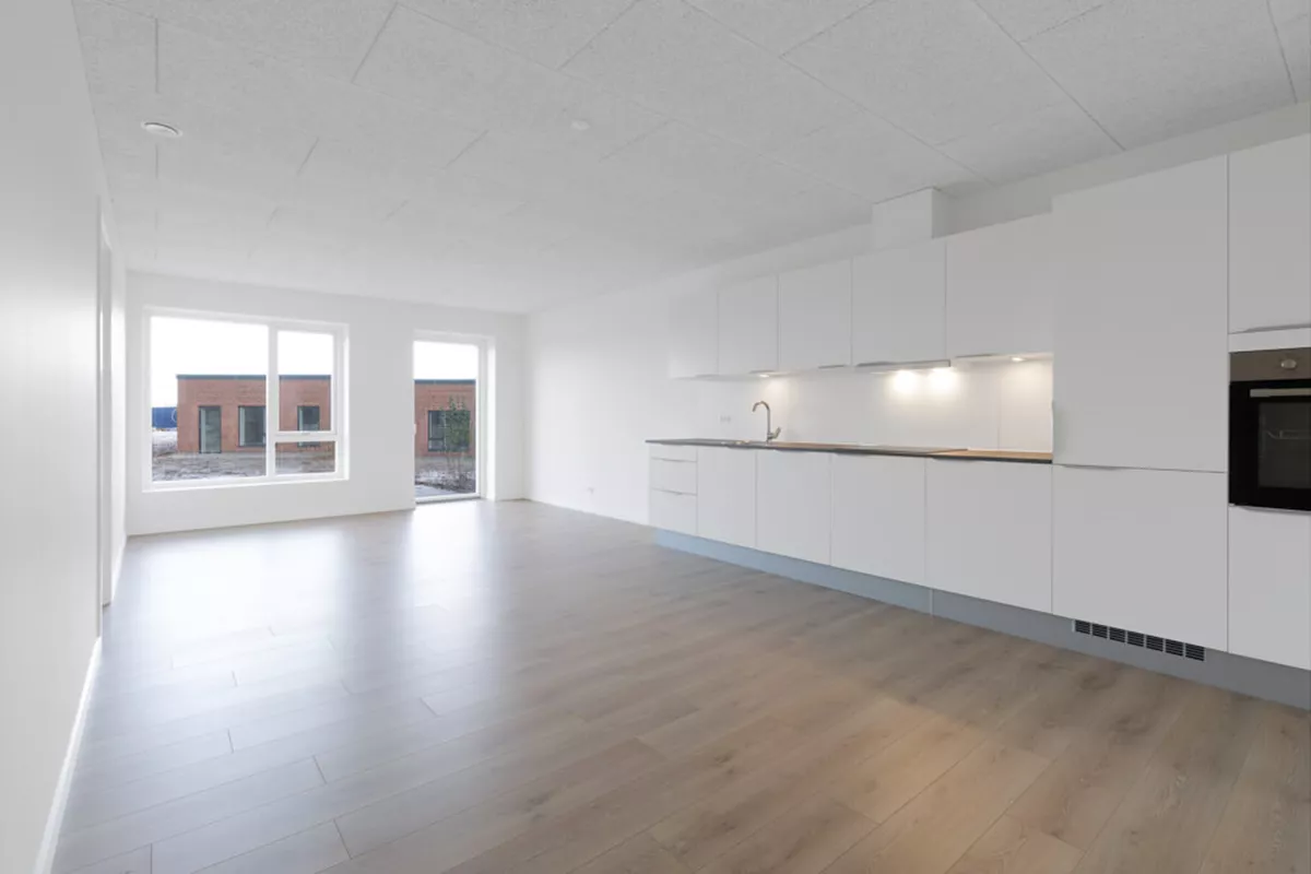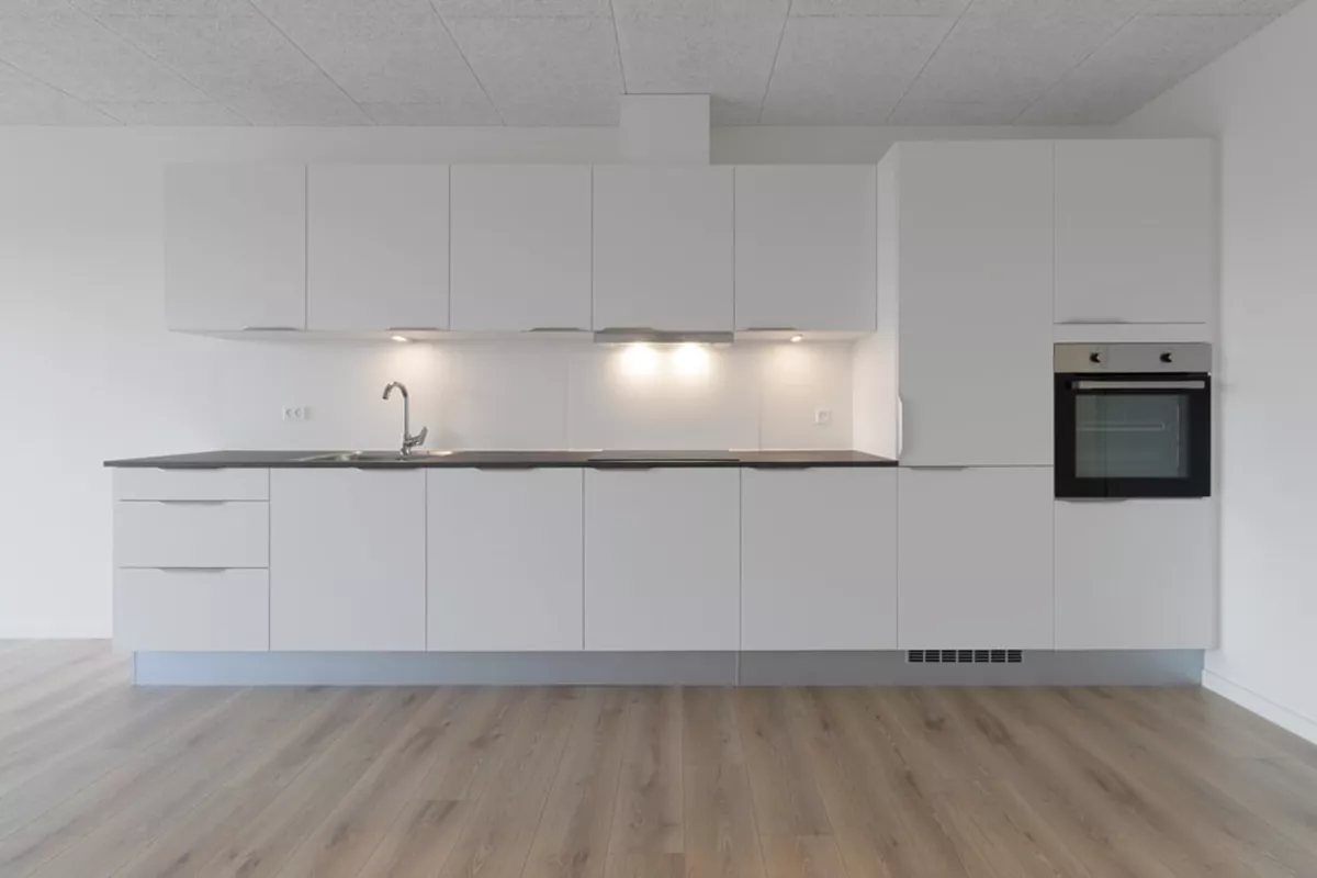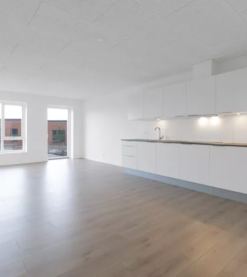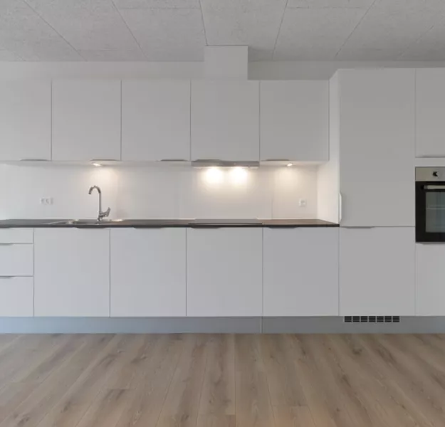 Dette skønne fireværelses rækkehus er bygget om et stort og hyggeligt køkken-alrum, som fungerer som boligens hjerterum. Køkkenet er placeret langs den ene væg, hvormed pladsen optimeres mest muligt. I alrummet er der altså god plads til et større spisebord og sofaområde til hele familien.