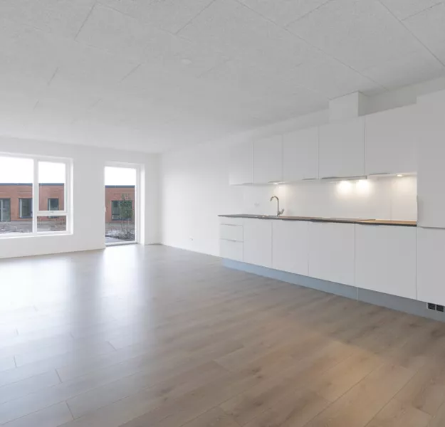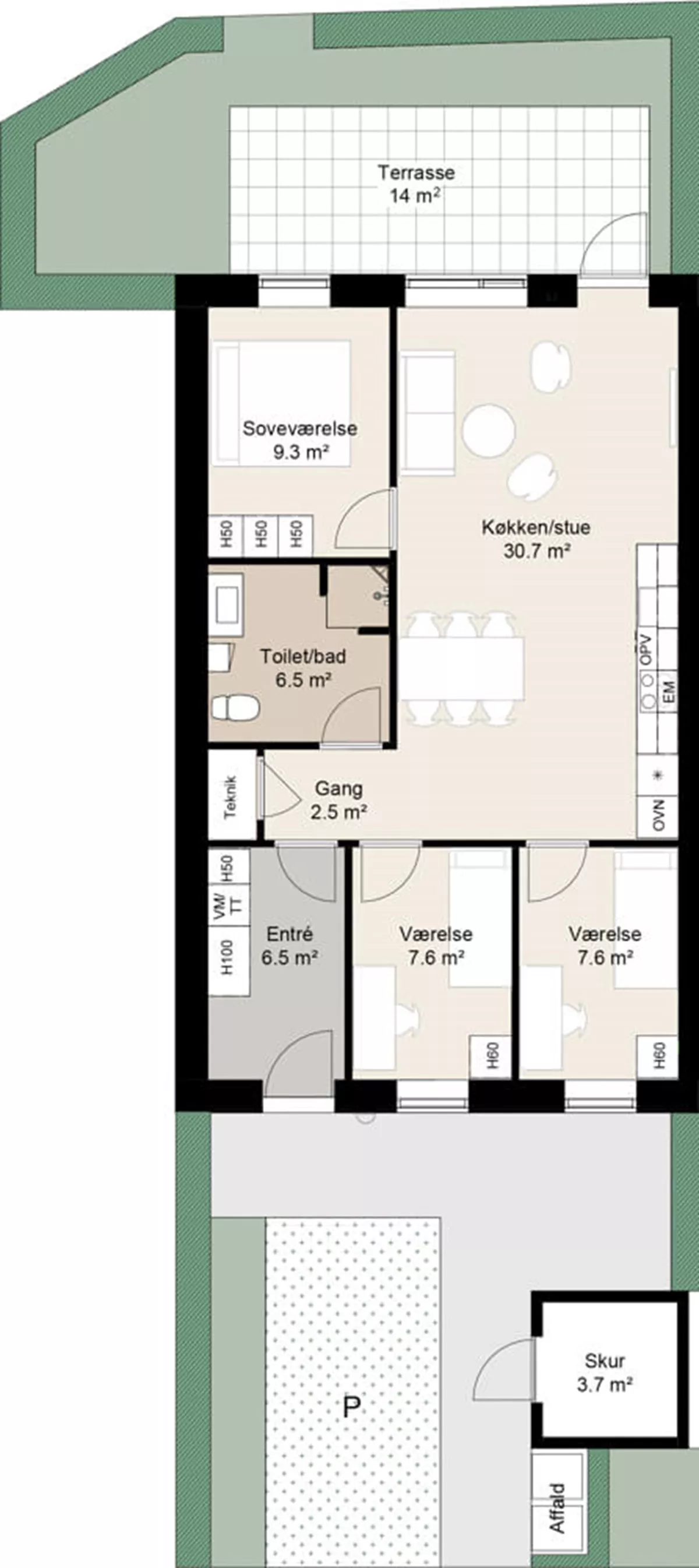 Boligen har to uderum – et foran boligen og et bag boligen. Foran er et stort flisebelagt udeområde, hvor man med fordel kan placere et cafésæt, stole eller krukker. Her finder du også et fint opbevaringsskur og en privat parkeringsplads. Bag boligen er den rummelige terrasse med et mindre græsareal, hvor du kan grille og slappe af i dine havemøbler. Obs. alle billeder og plantegninger er vejledende.