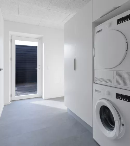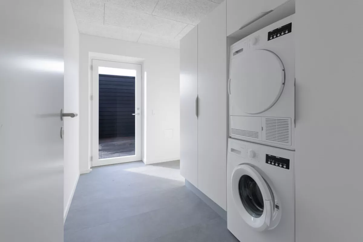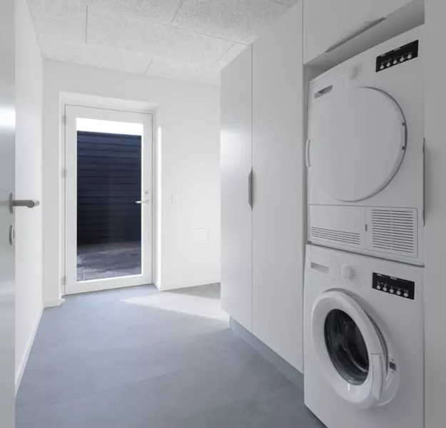I boligens entré finder du en masse opbevaringsplads samt vaskesøjle med vaskemaskine og tørretumbler. Der er i øvrigt god plads til yderligere at indrette med ekstra opbevaring eller blot pynte med en bænk og planter.
