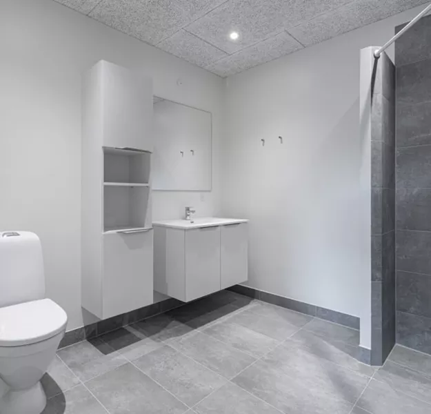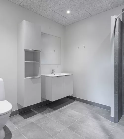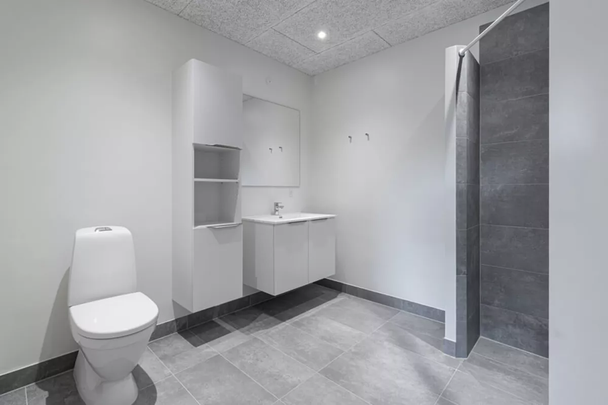 Badeværelset tilgås via den lille gang, der også forbinder køkken og entré. Badeværelset opføres i stilrene kvalitetsmaterialer og farver, der passer til resten af boligen. Det indeholder toilet, håndvask med opbevaring, væghængt skab samt en bruseniche.